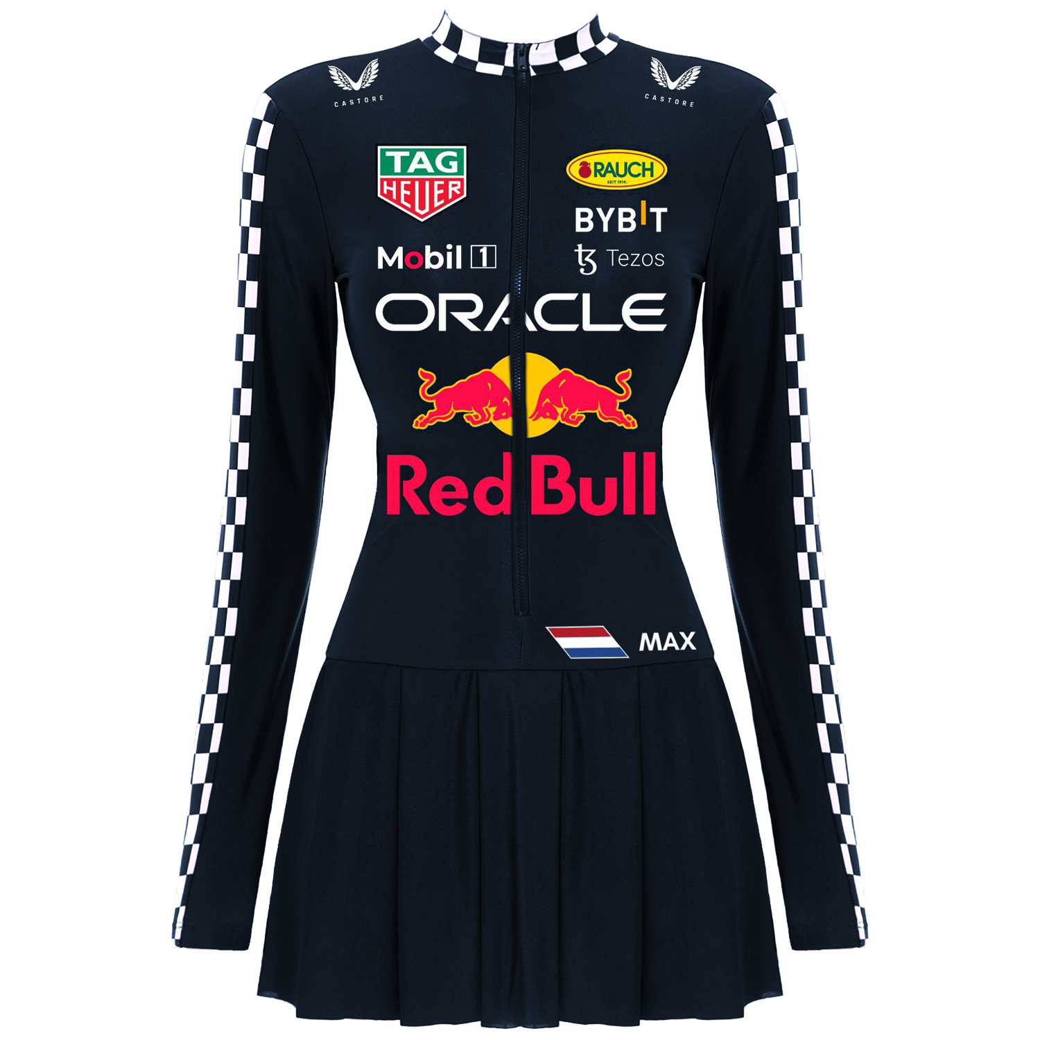 • Design Elements: Checkerboard accents on sleeves, front zipper closure, pleated skirt design