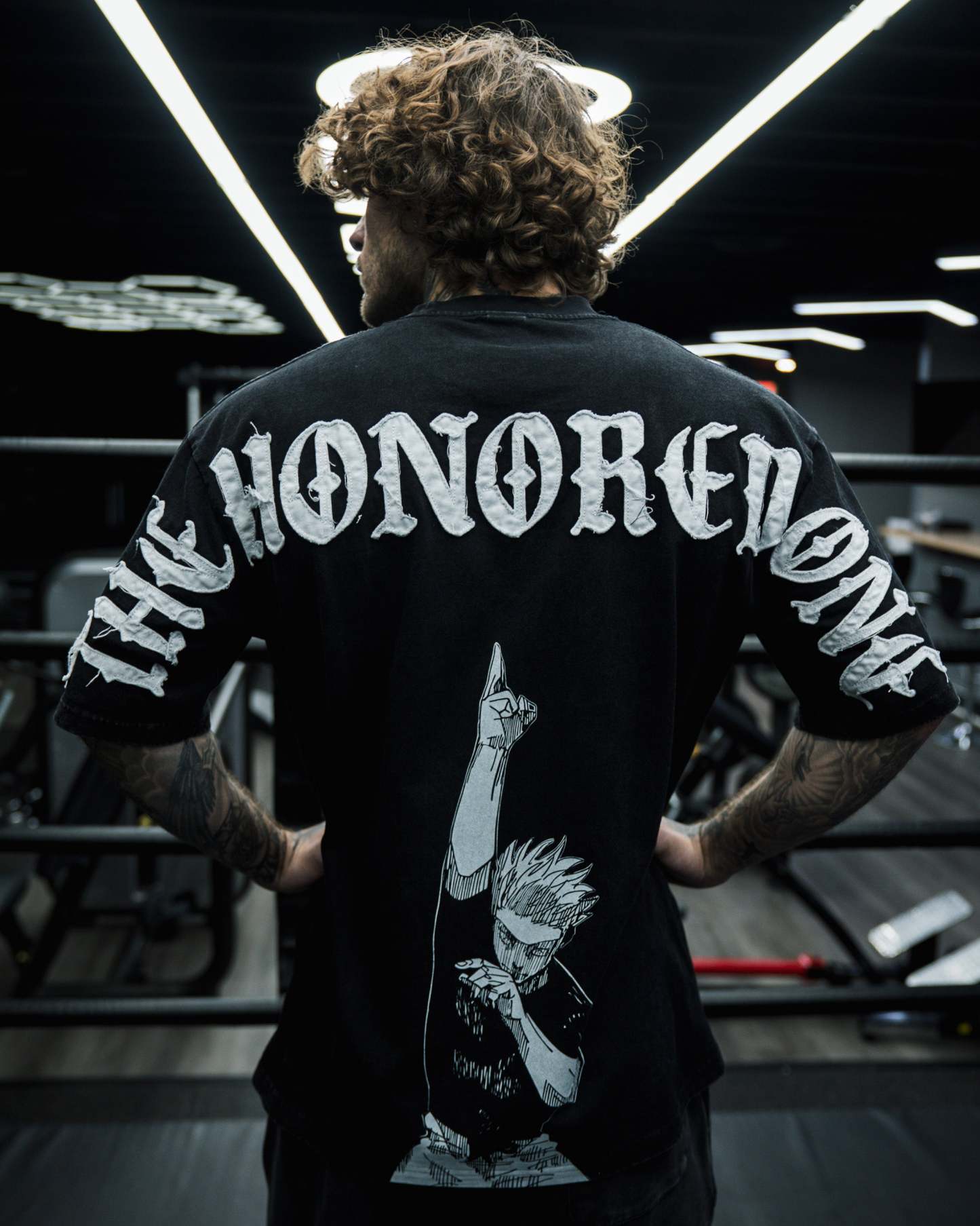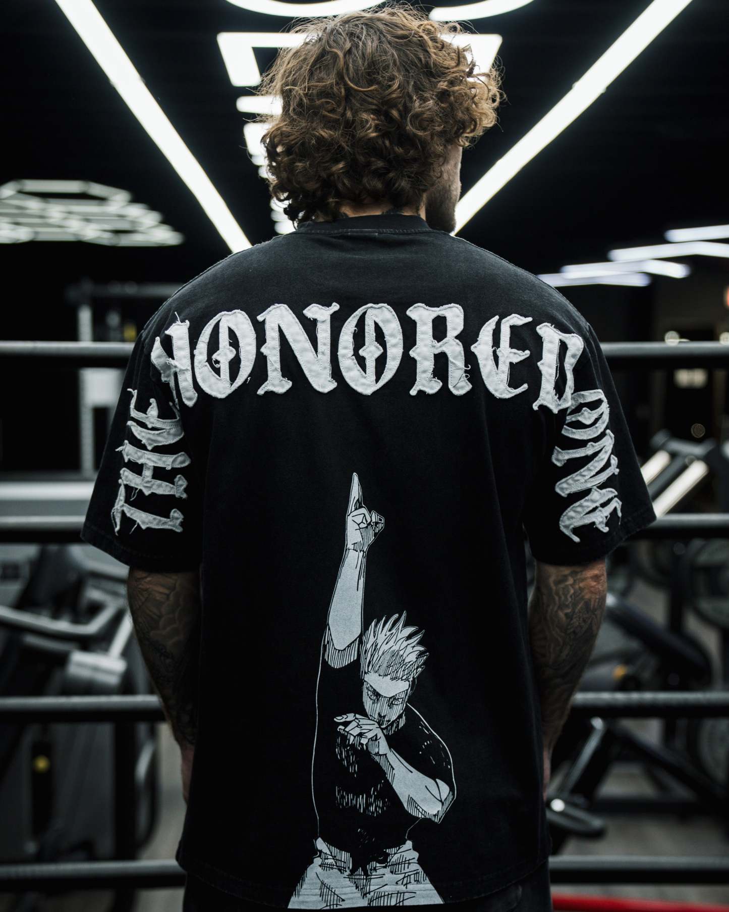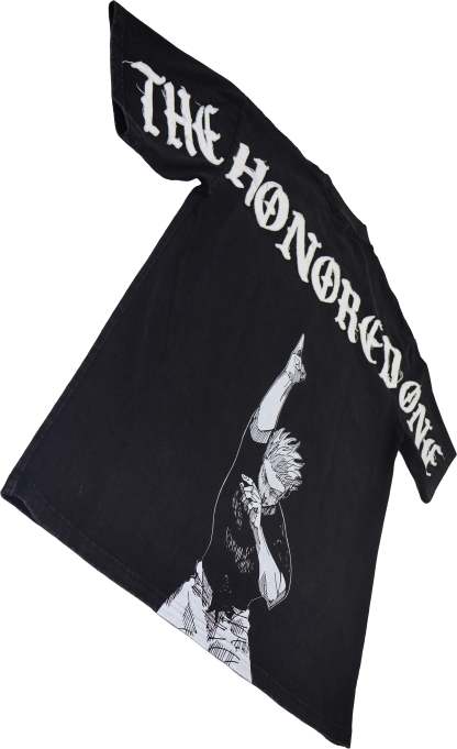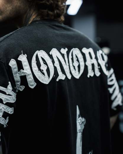 DESIGN: Direct-to-garment print on the front with a 14" distressed embroidery, and a direct-to-garment print on the back.